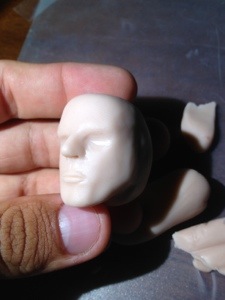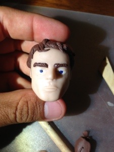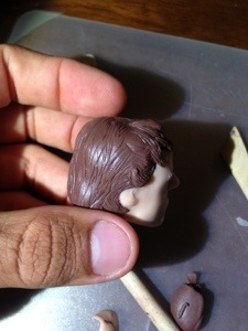 I covered his head with a thin layer of brown clay, and then I added small triangular pieces to show its curls. Once I got done with that, I covered the seams and started on the hair detail.
